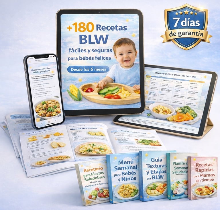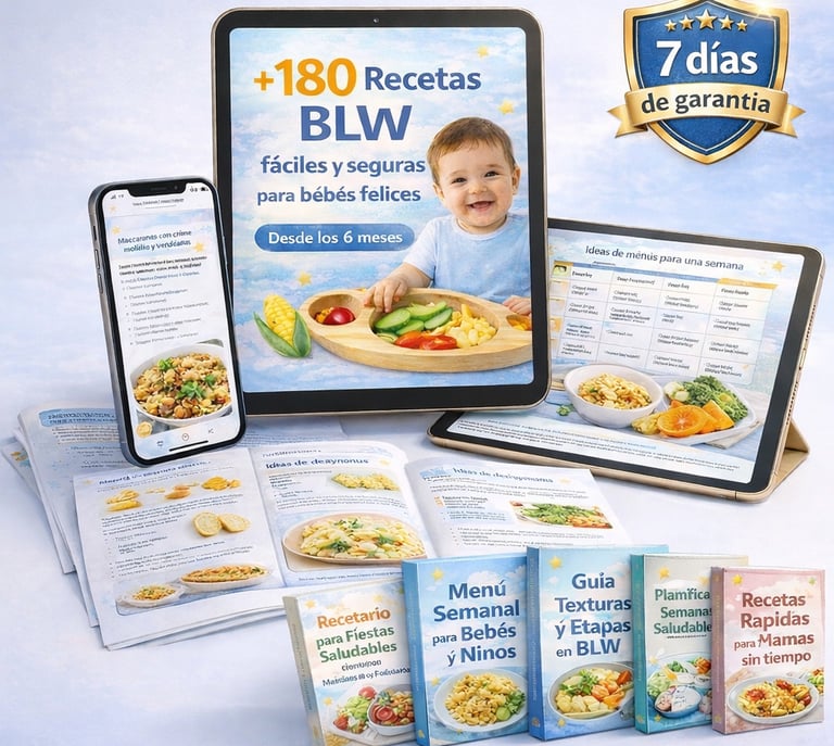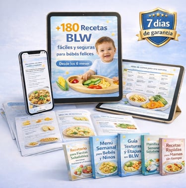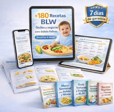Incluye más de 180 recetas BLW, explicadas de forma clara y visual, pensadas para facilitar el día a día y hacer que las comidas sean más tranquilas, seguras y agradables tanto para el bebé como para la familia.